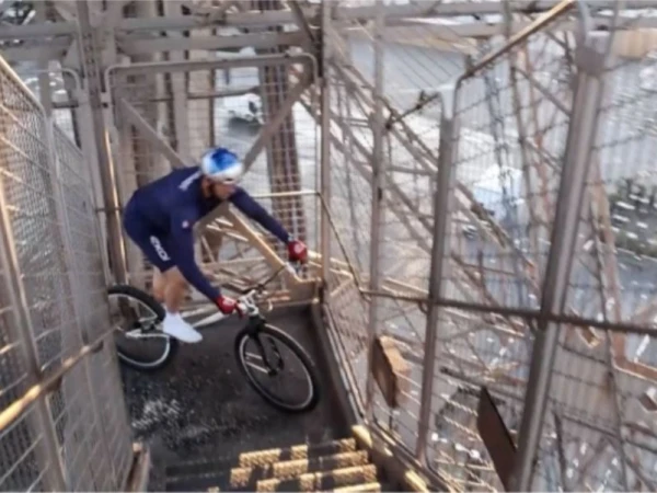 پیرس: فرانسیسی سائیکل سوار اوریلین فونٹینائے نے دنیا کو حیران کرتے ہوئے ایفل ٹاور پر سائیکل چلا کر نیا ریکارڈ قائم کردیا۔