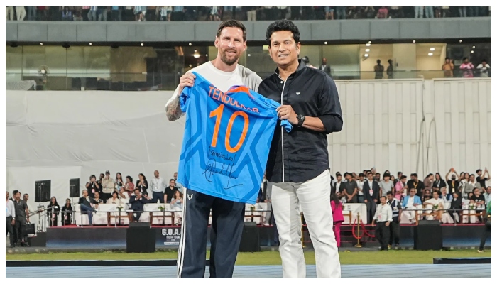 شہرہ آفاق اسٹار فٹبالر لیونل میسی ان دنوں بھارت کے دورے پر ہیں جہاں ان کی ملاقات وانکھیڈے اسٹیڈیم میں کرکٹ کے بڑے نام سچن ٹنڈولکر سے ہوئی۔