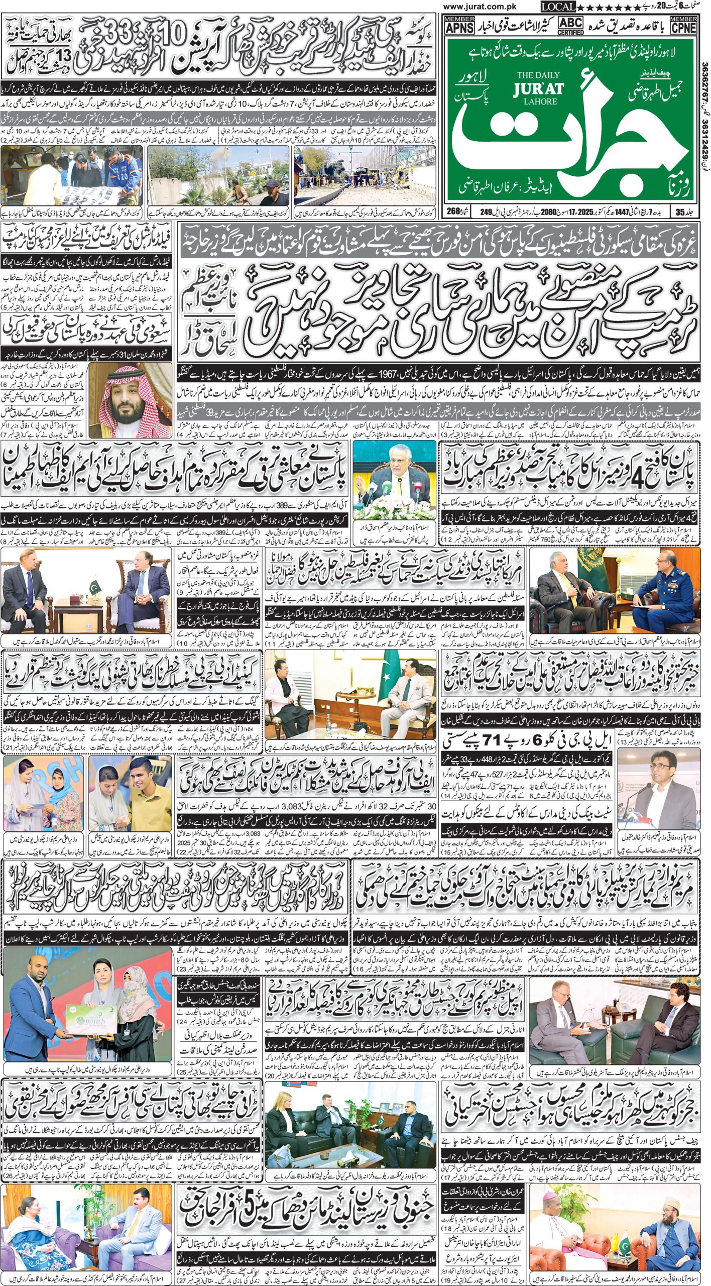 Copyright © 2025. Daily Jurat All rights reserved. Head Office Tijarat Group of Publications: 14/28 Davis Road, Lahore , Pakistan