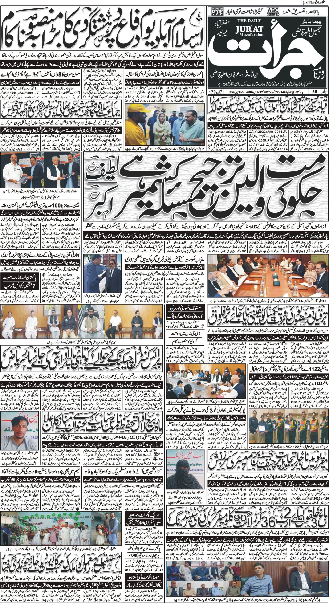 google-site-verification: google1831641f604228ef.html روزنامہ جرات مظفّرآباد اور میرپور 27 اگست 2025 - Daily Jurat - Breaking News, Latest and Live